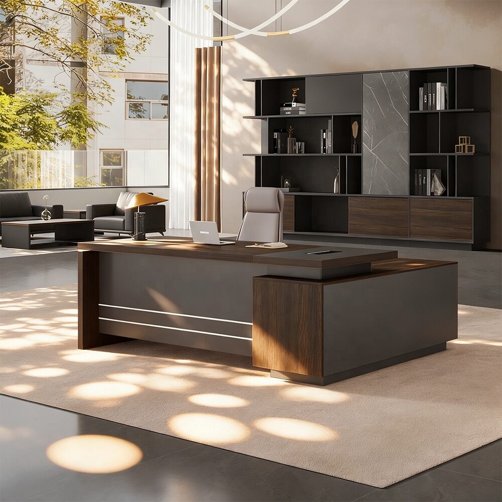 Available in elegant finishes such as walnut, mahogany, oak, or modern laminated textures, this desk enhances the professional appearance of: