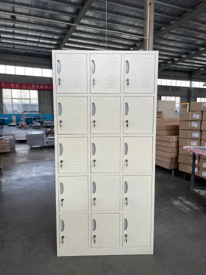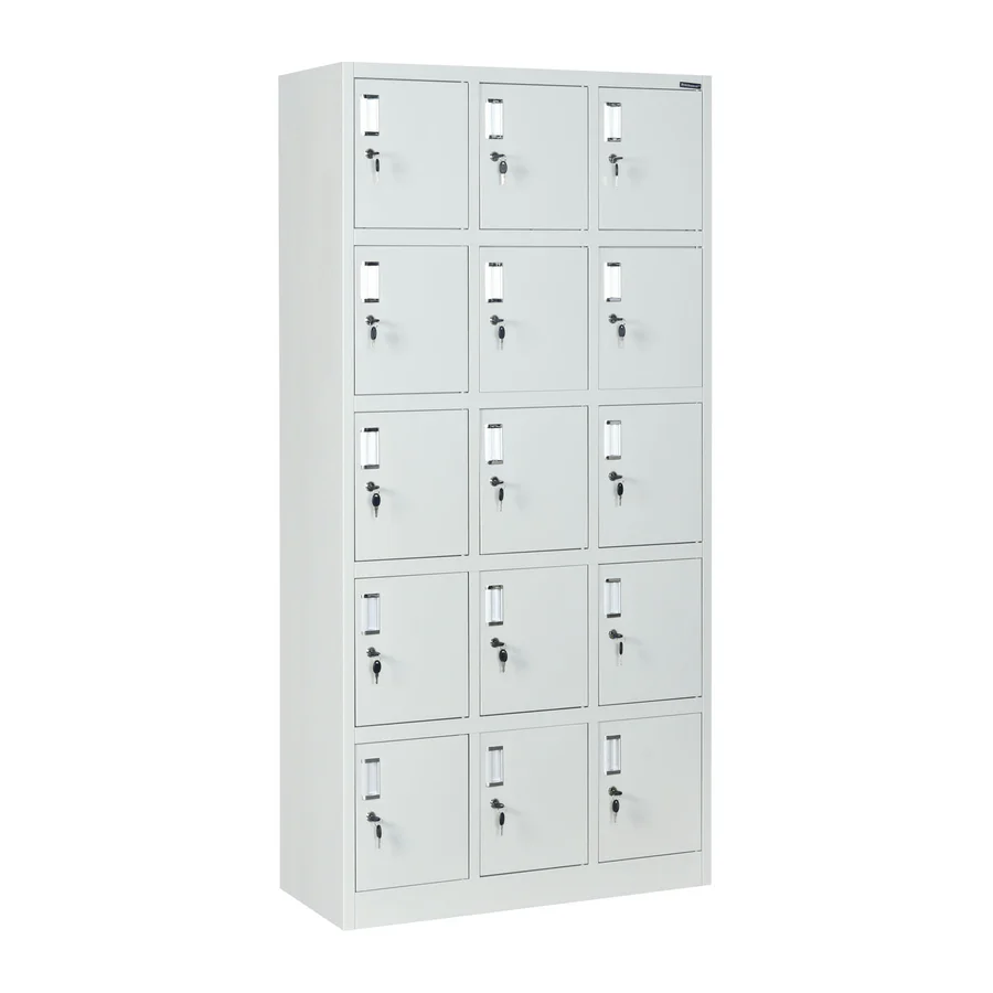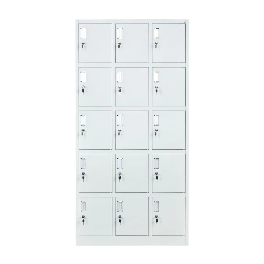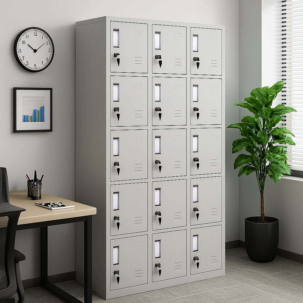 Organize personal belongings and office items efficiently with this 15-locker steel storage cabinet, designed for durability, security, and high-capacity storage. Ideal for offices, schools, factories, gyms, and staff changing rooms, it provides individual secure compartments in a professional, space-efficient design.