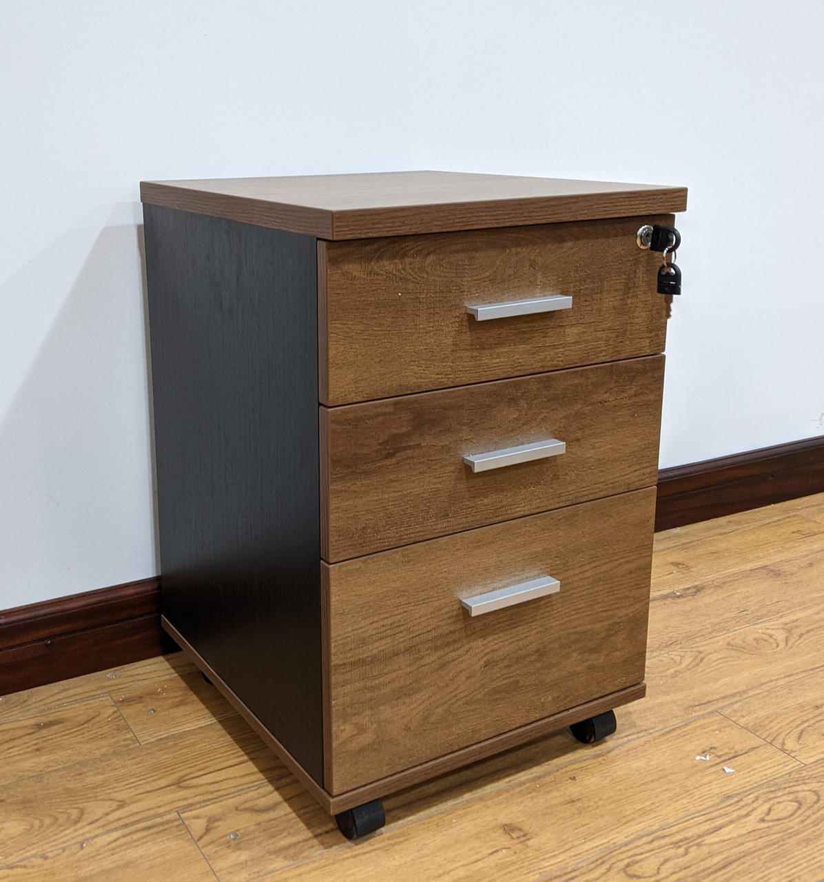Choose this 3 drawer mobile pedestal in dark oak for a practical, stylish, and efficient storage solution that keeps your workspace neat and productive.