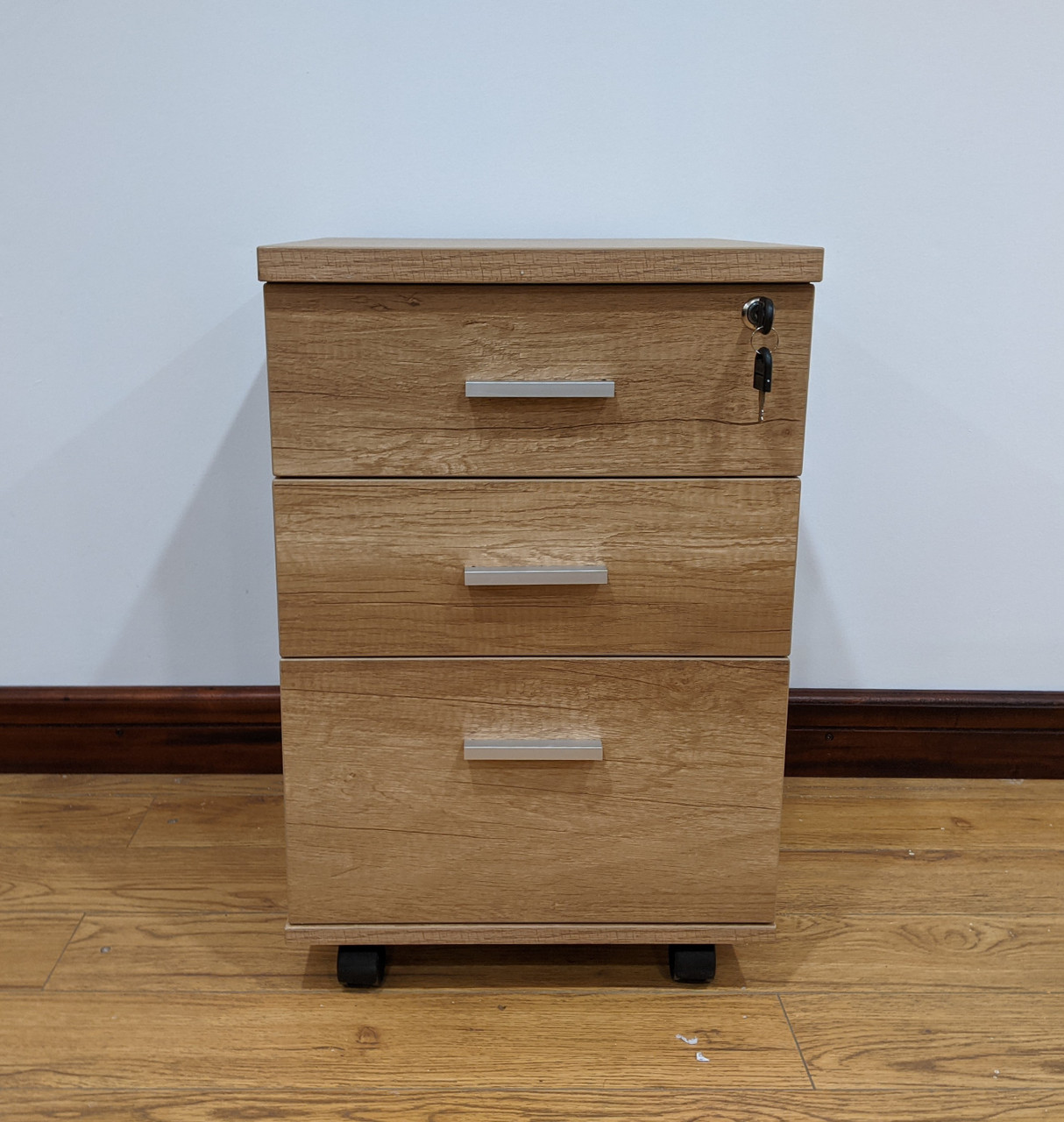 The pedestal features three smooth-gliding drawers suitable for files, documents, stationery, and personal items. The top drawer is ideal for smaller office supplies, while the lower drawers handle larger documents efficiently.