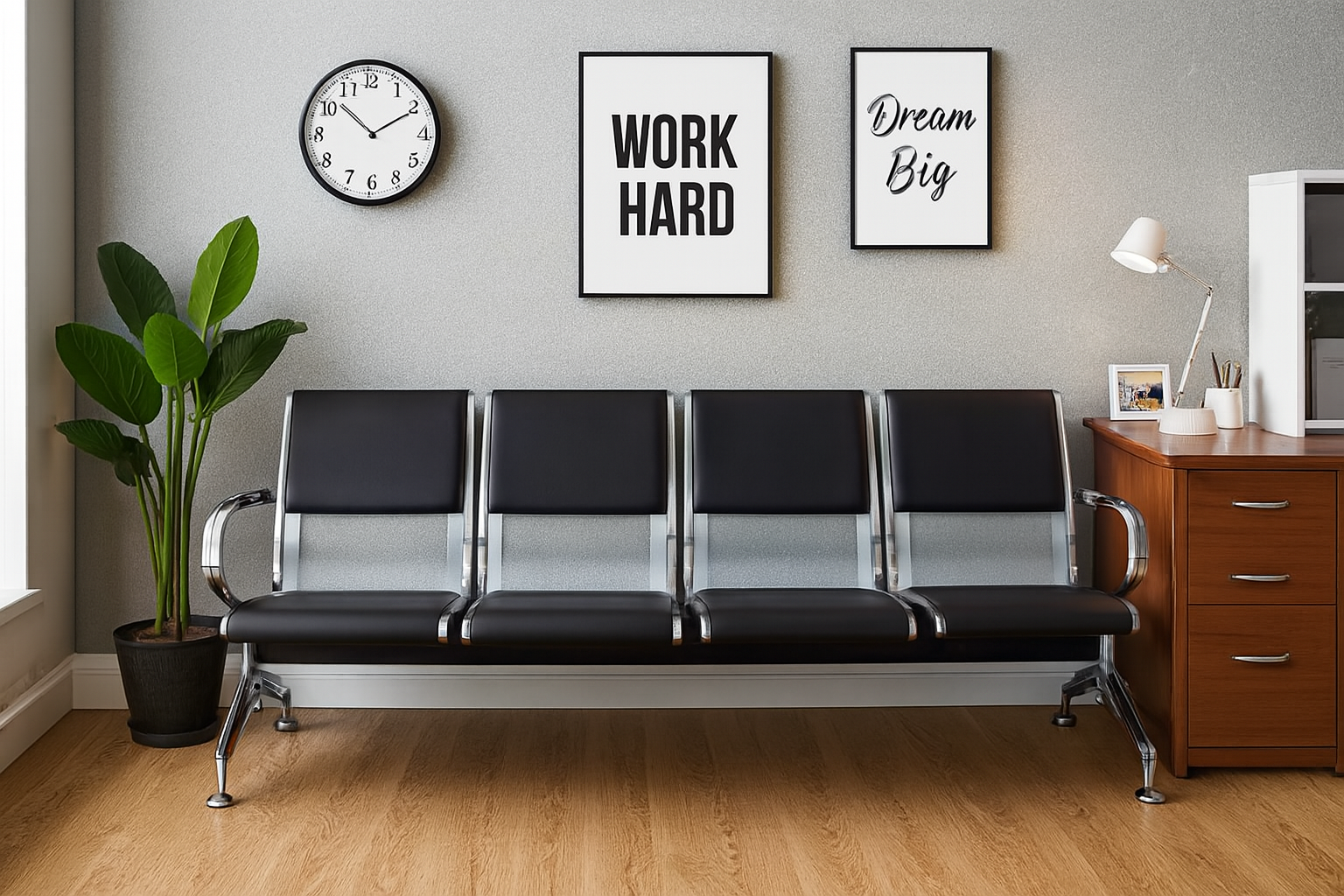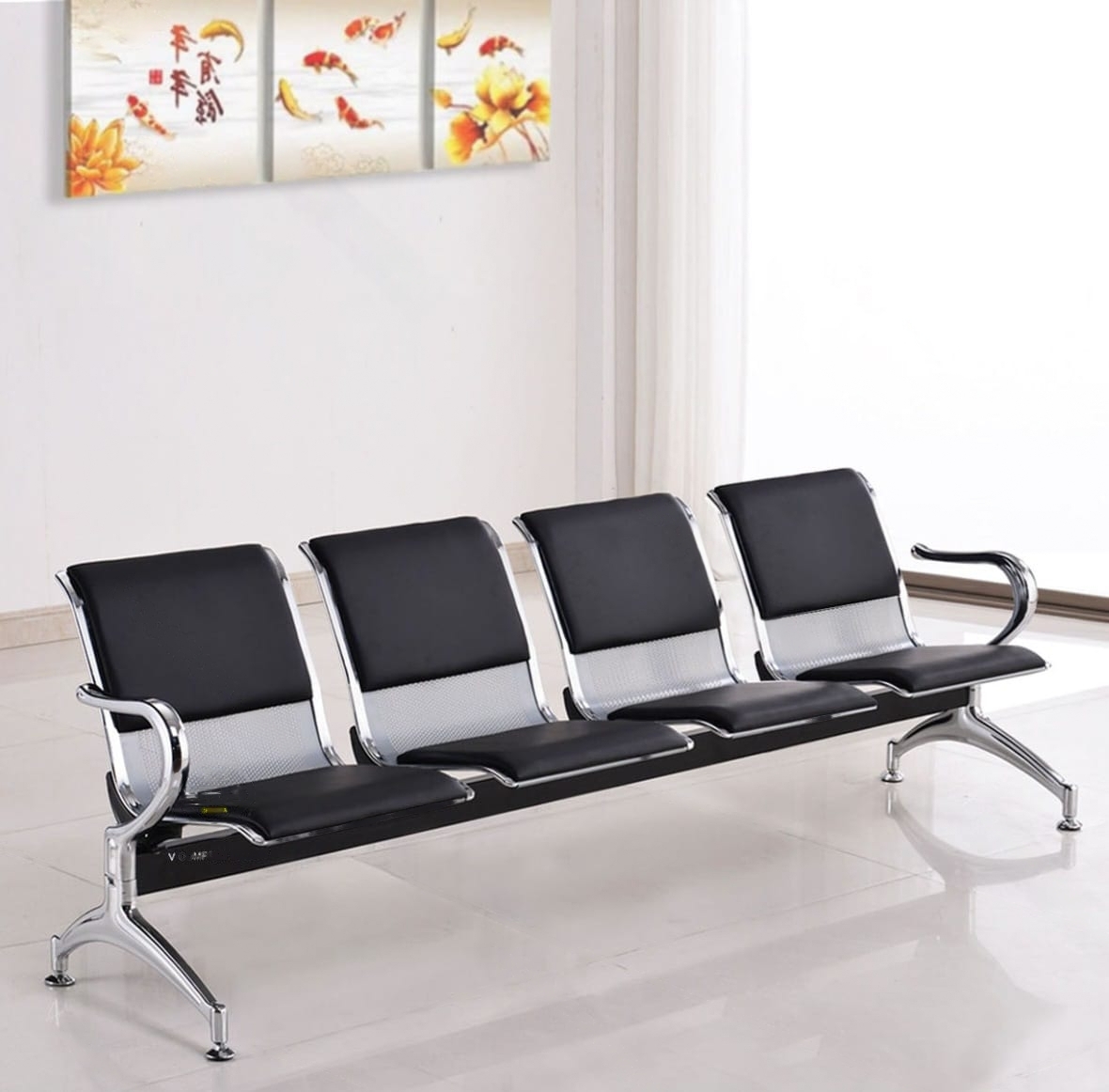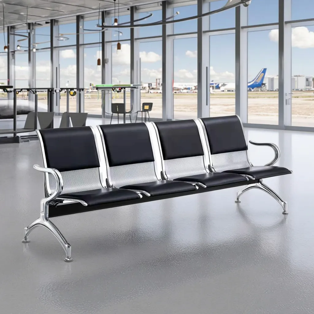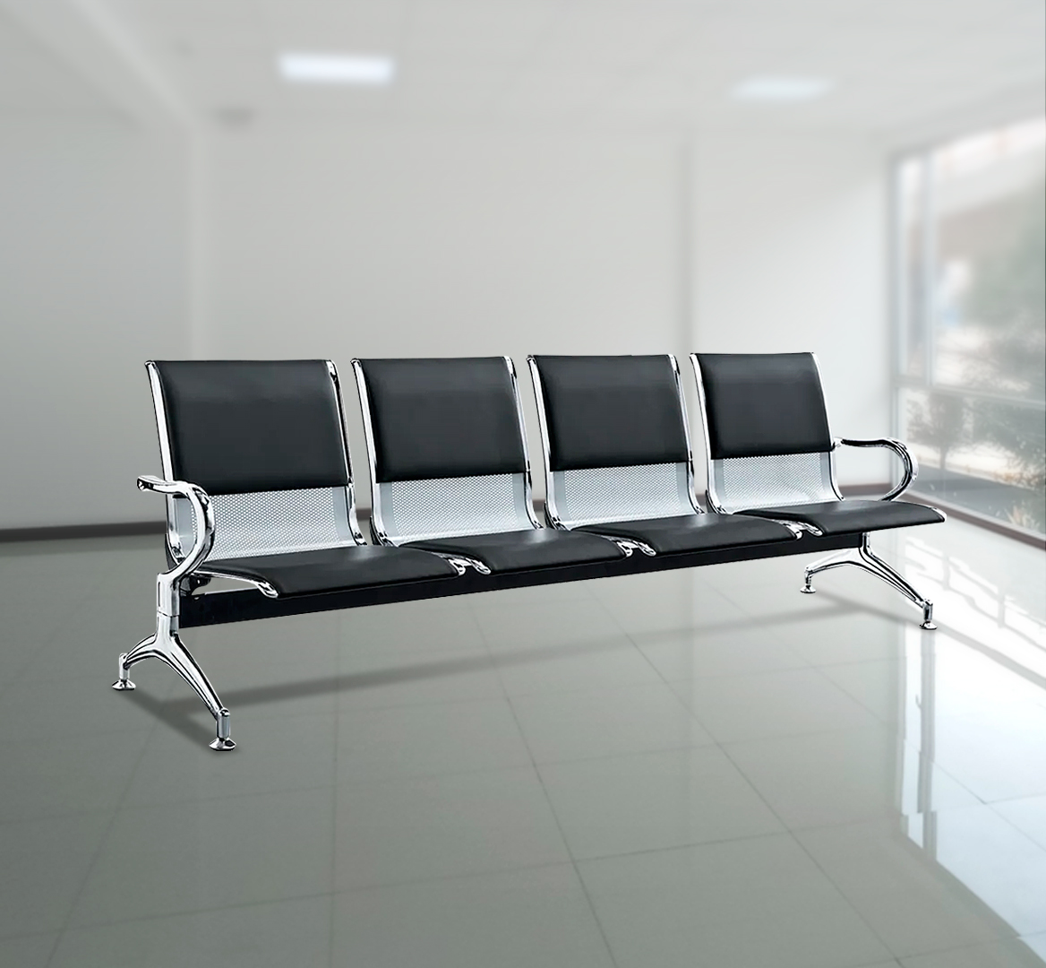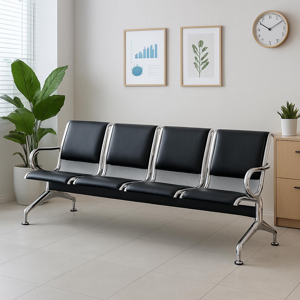 This waiting bench features four connected seats, allowing multiple visitors to sit comfortably at the same time. The linked design maximizes seating capacity while keeping the reception area neat and well organized.