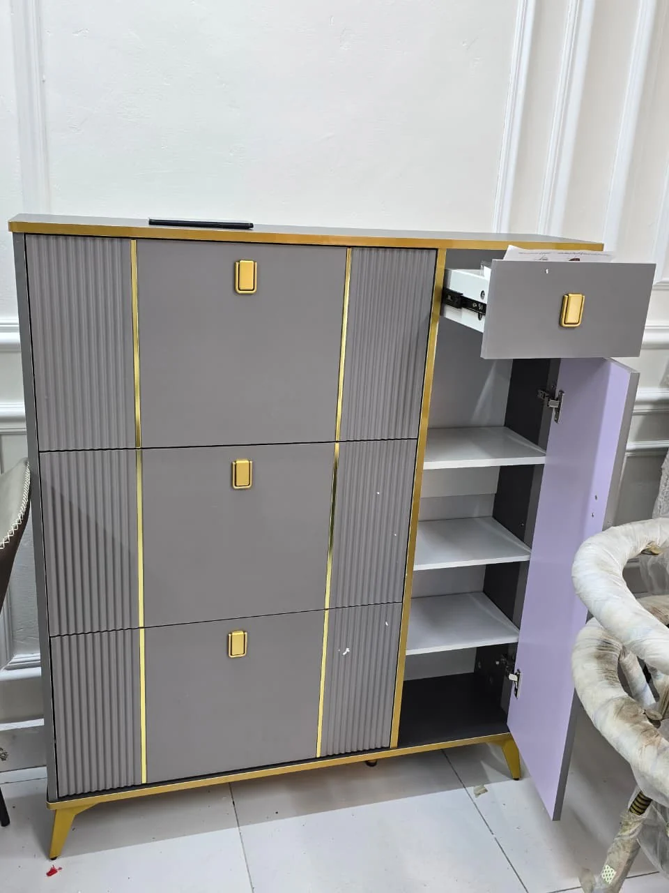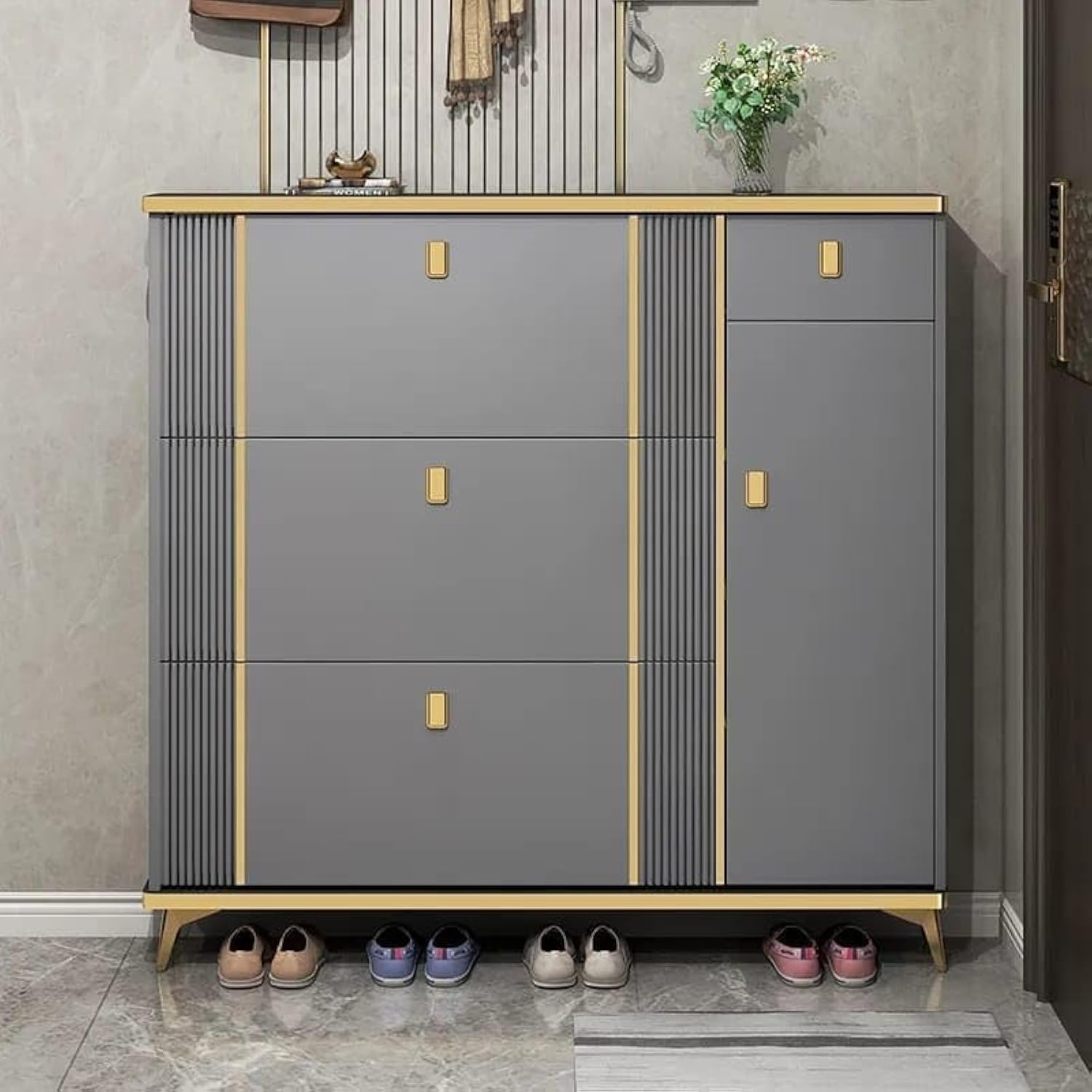 Keep your entryway neat and stylish with the Bucket Flip Shoe Rack Cabinet, a modern storage solution designed to maximize space while maintaining elegance. Featuring flip-down bucket-style compartments, this cabinet allows you to store and access your shoes conveniently without clutter.