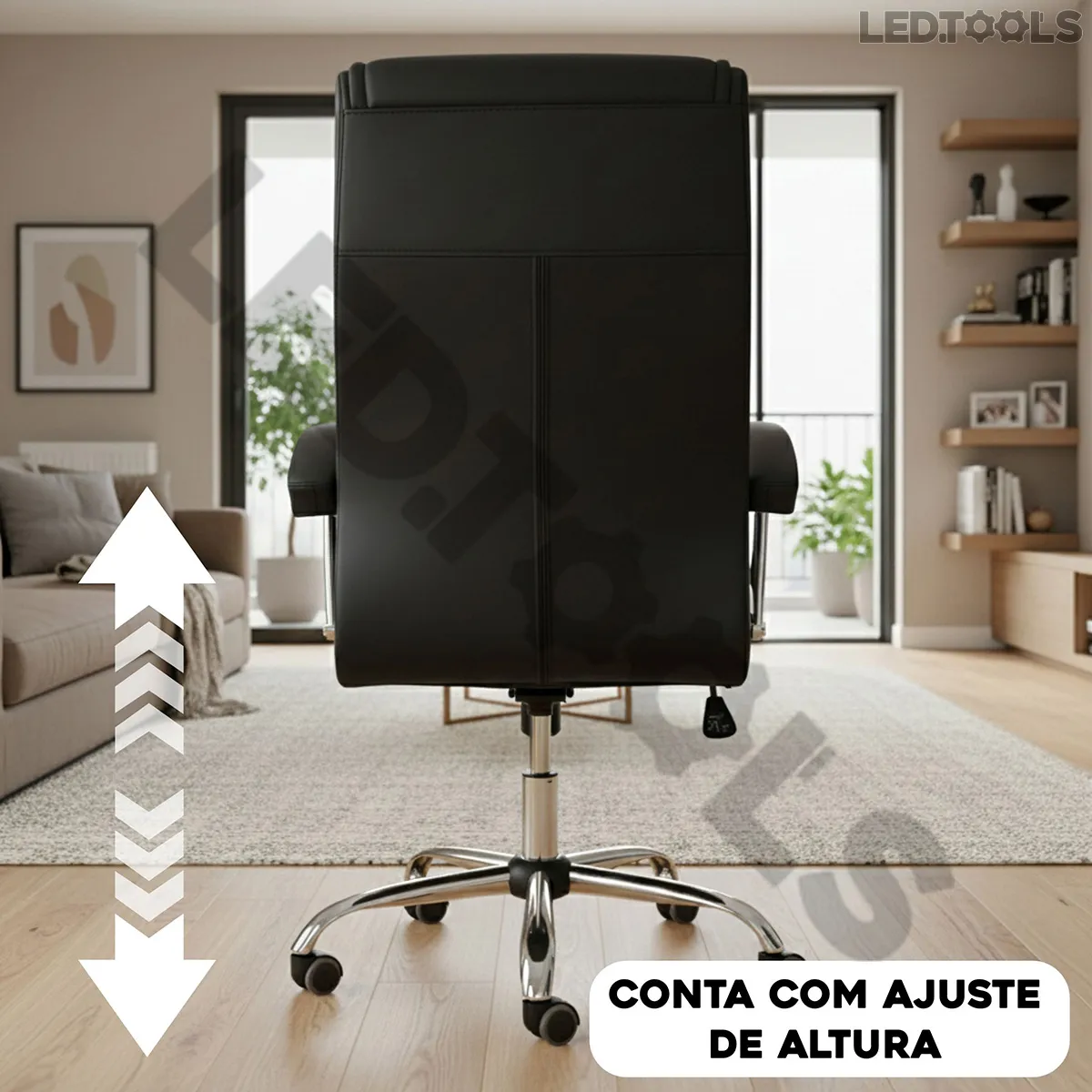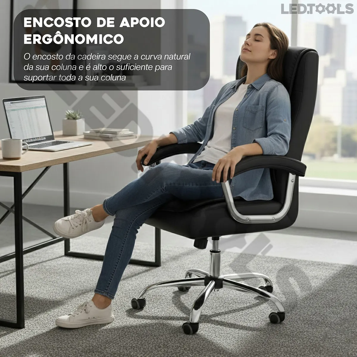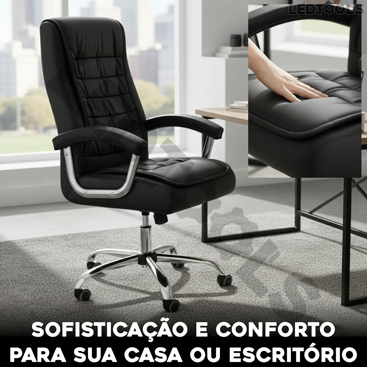 The director’s high-back leather office seat includes adjustable height, tilt, and recline mechanisms for personalized comfort. A strong chrome or reinforced base, smooth-rolling caster wheels, and 360-degree swivel provide stability and effortless movement.
