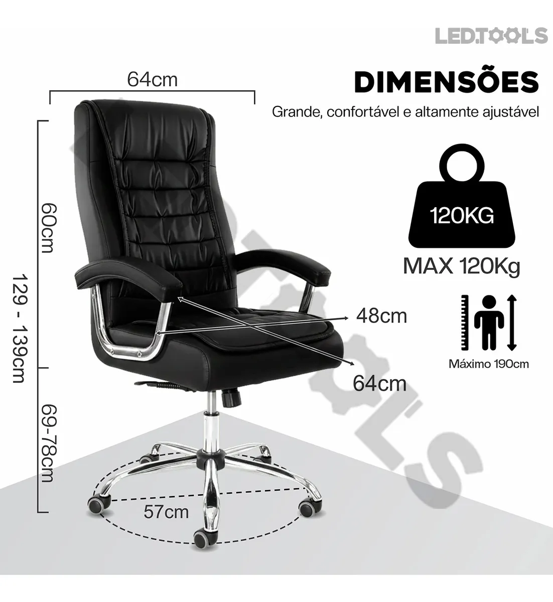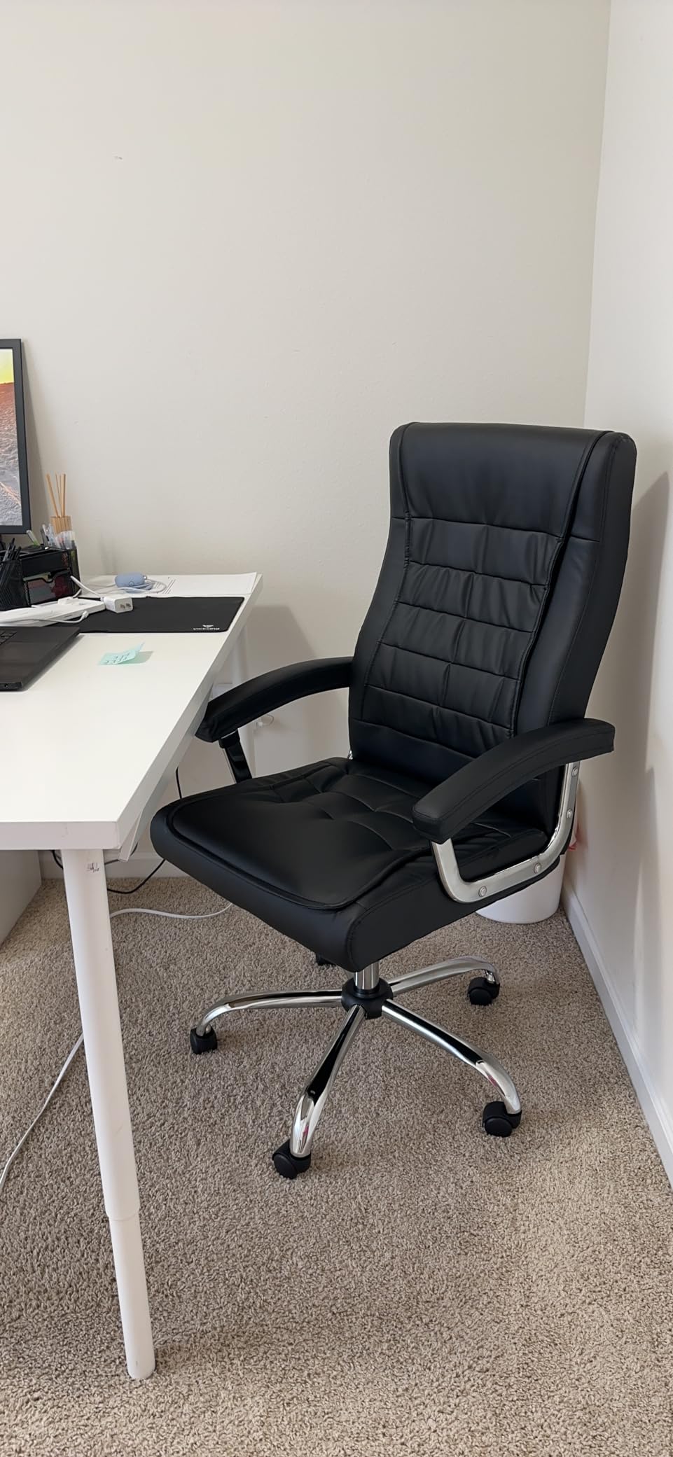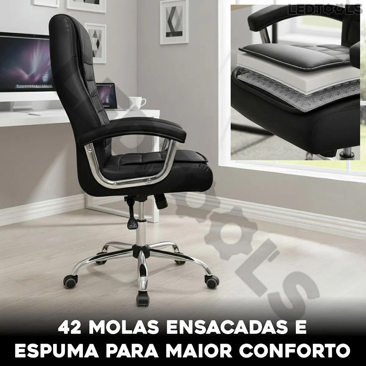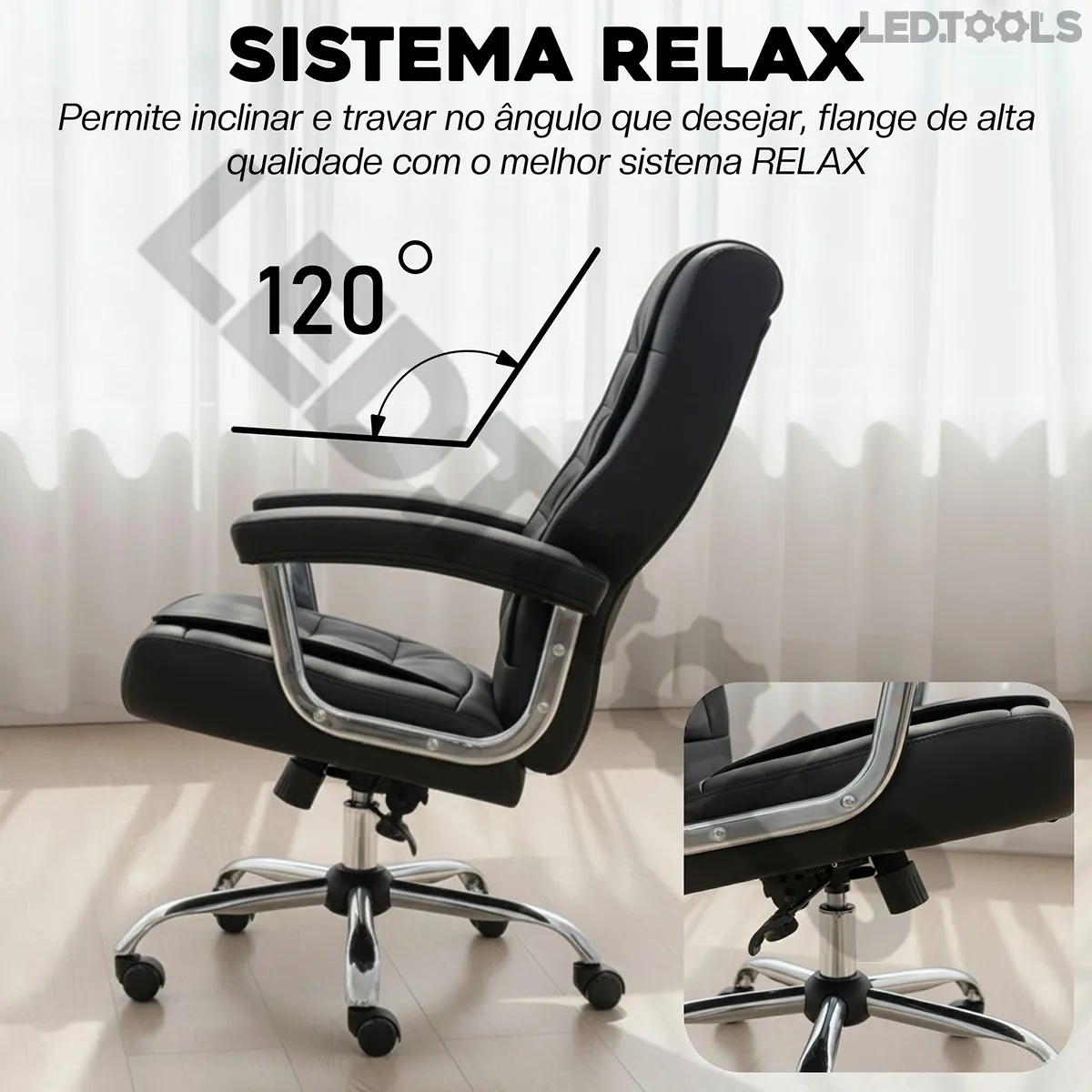 The director’s high-back leather office seat includes adjustable height, tilt, and recline mechanisms for personalized comfort. A strong chrome or reinforced base, smooth-rolling caster wheels, and 360-degree swivel provide stability and effortless movement.