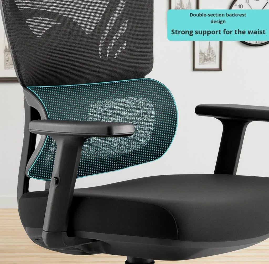 The chair features a high backrest with lumbar and spinal support. Its ergonomic contours follow the natural curve of your spine, reducing strain on your lower back and shoulders. This design helps improve posture and prevents fatigue during extended sitting sessions.